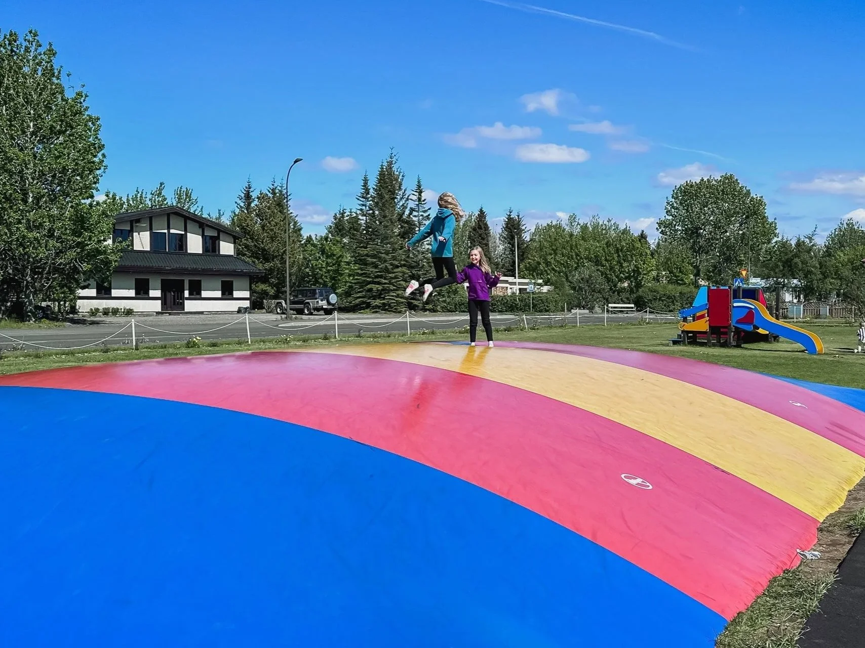 On our first drive from Reykjavík to Hvolsvöllur, we spotted what looked like a giant, colorful, half-buried balloon. We soon discovered these are called ærslabelgur (jumping pillows), and they are scattered all over the country!